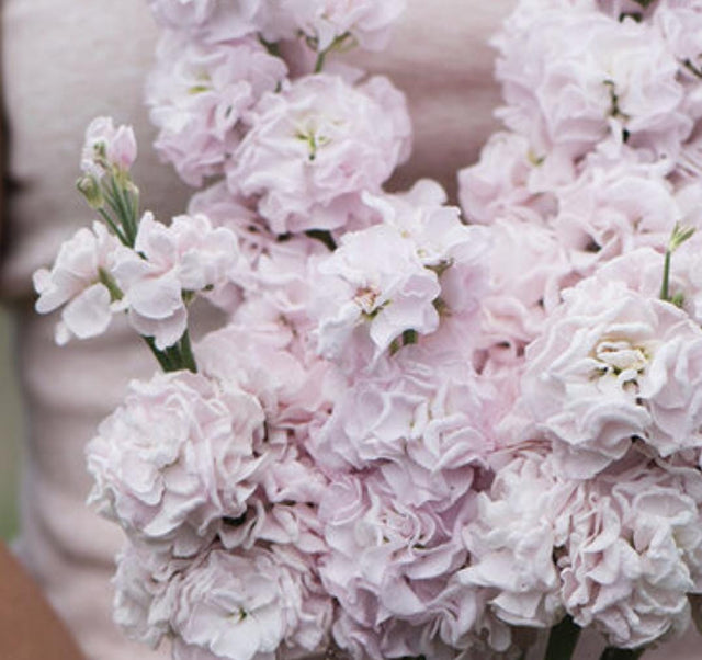 Soft blush/rose pink blooms with a full appearance. Early single-stem, or column-type stock in a highly uniform series for one-cut harvest. Tightly spaced florets on the flower spike make for compact 1 1/2–2" blooms. Cold weather crop - does well in spring and fall.