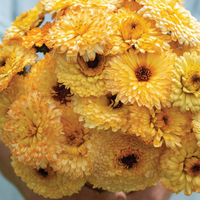 2–3" wide, fully double blooms. Tall, vigorous, healthy plants with sturdy stems. Also known as pot marigold, common marigold, and Scotch marigold.