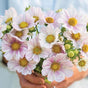Cosmos Bipinnatus. Pale blush pink blooms that measure about 2 1/2" across. Strong, straight stems can withstand considerable handling. Produces under short days.